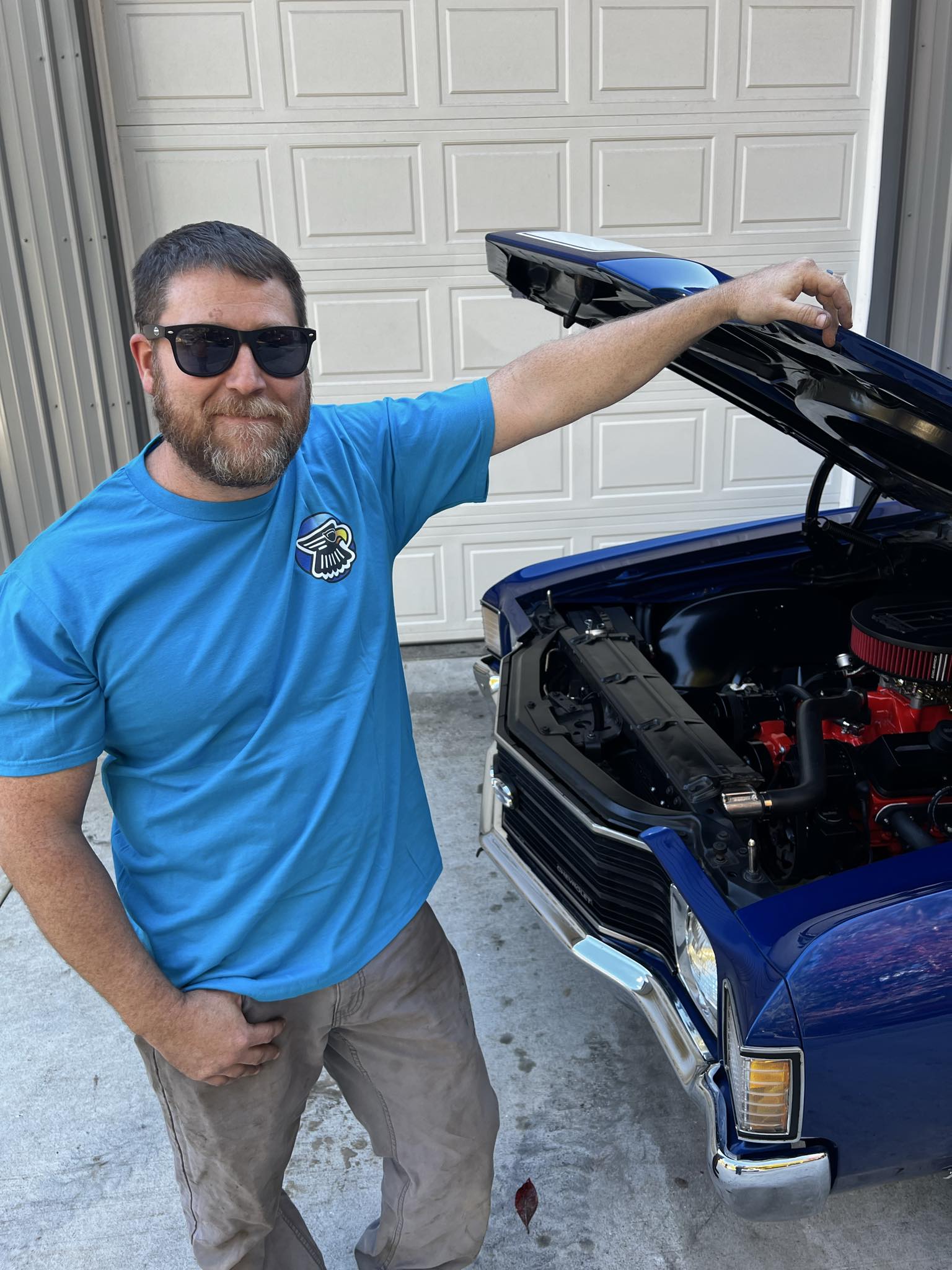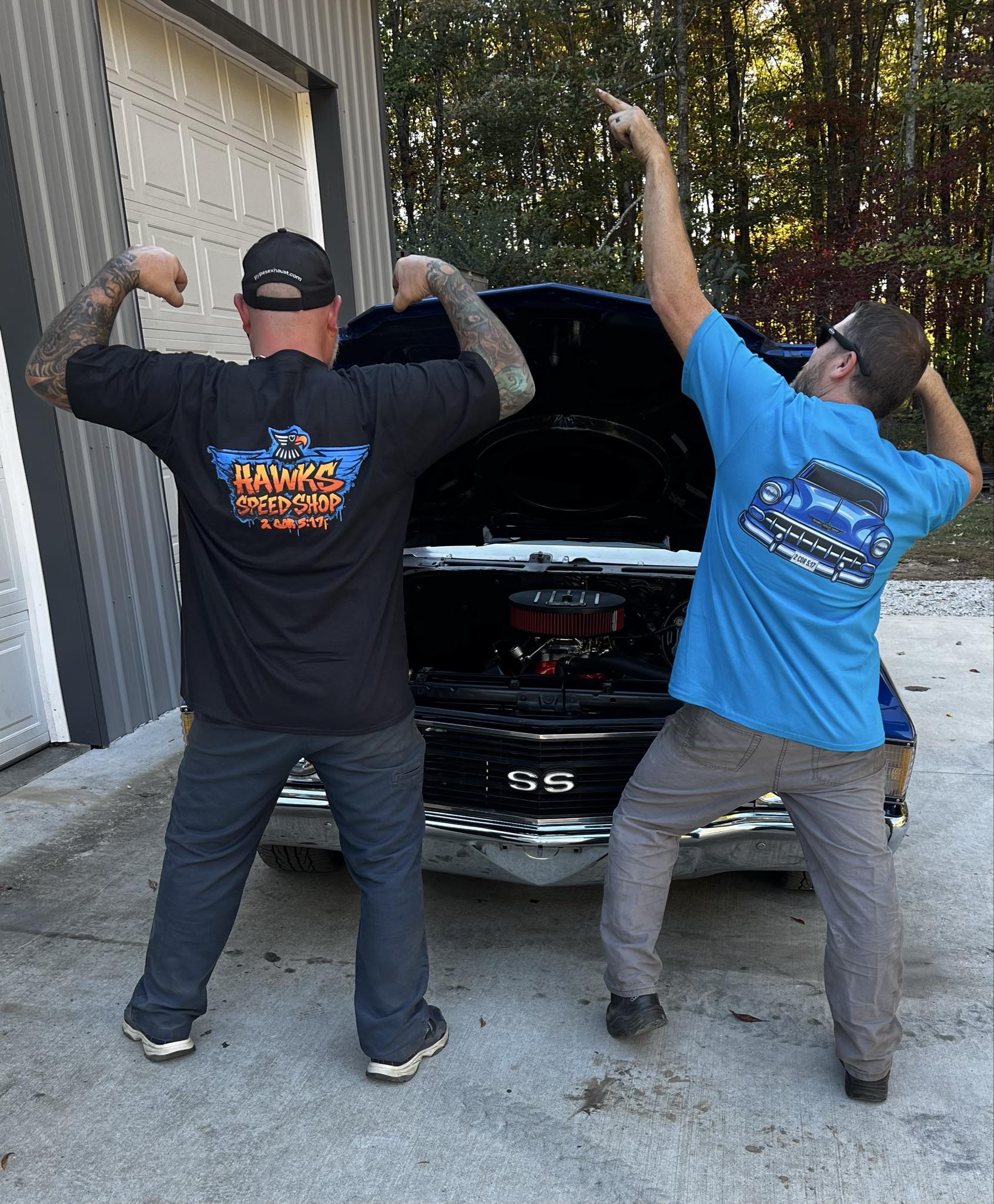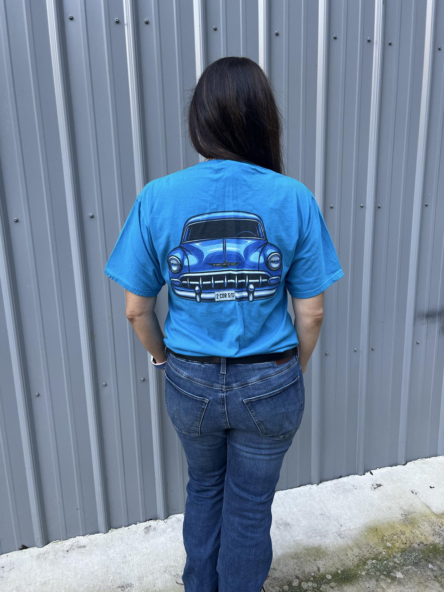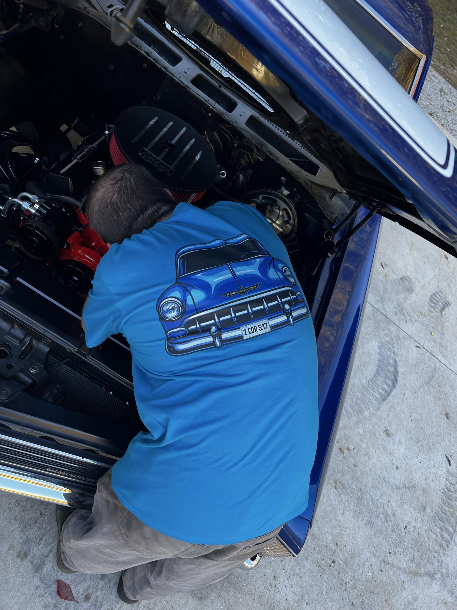 Hawks Blue T-Shirt with the 54 Bel Air on the back and shop logo on the front.